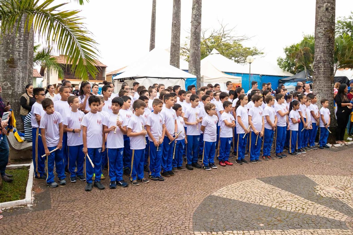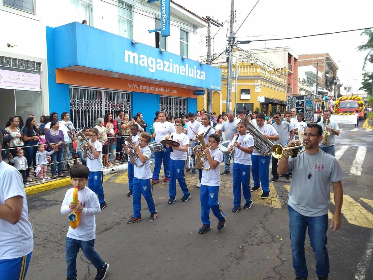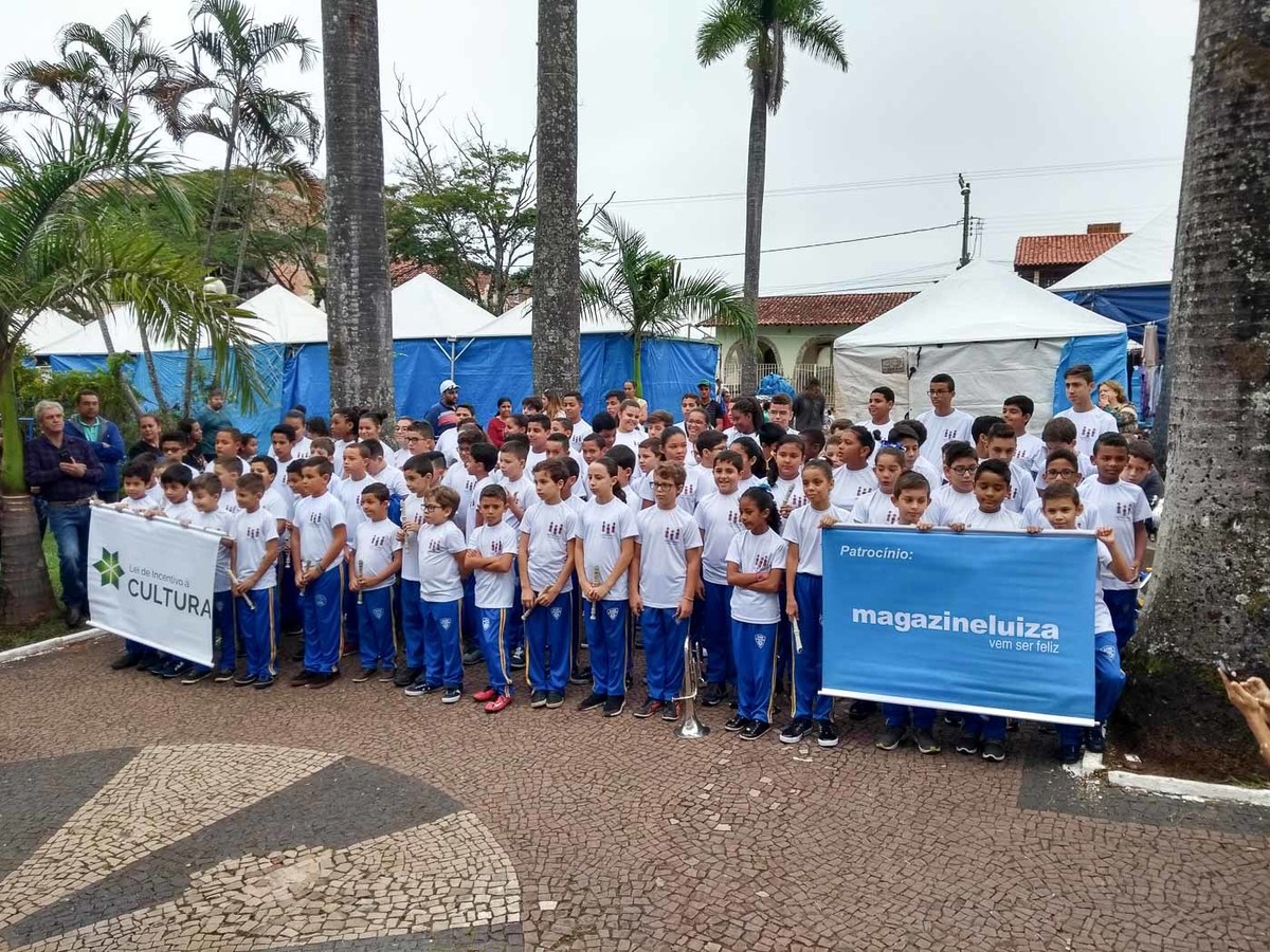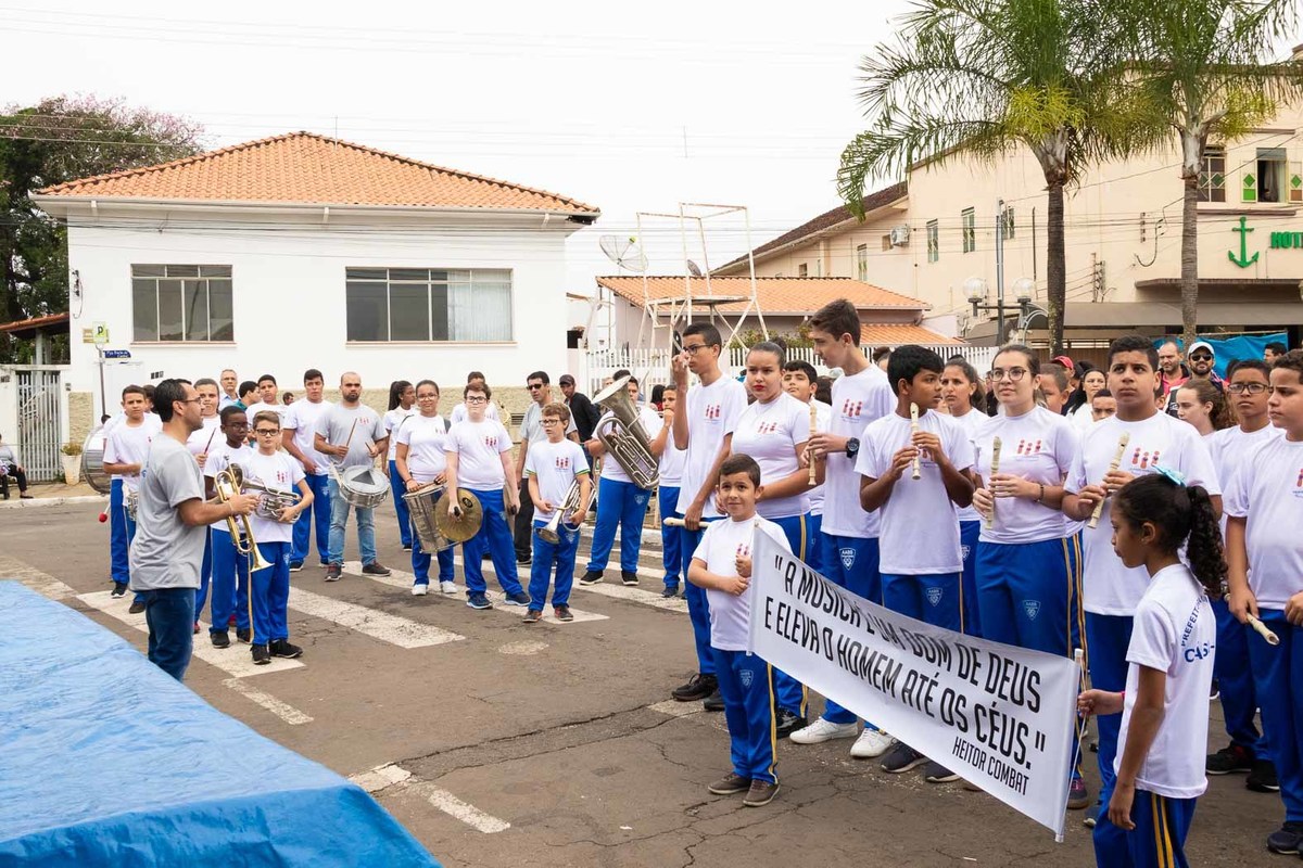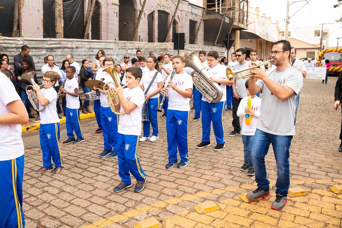 Logo após desfilam junto à Banda Maestro Godofredo de Barros tocando a música "Parabéns à você" em comemoração aos 129 anos da cidade de Cássia pela Praça Barão de Cambuí diante da população cassiense e visitantes.